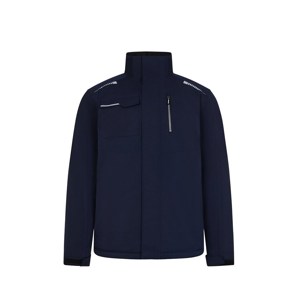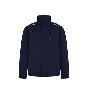 Quilted jacket (180 g/m²), made from recycled polyester (50%) and polyester (50%). Features water-repellent stretch fabric, heat-sealed seams, reflective details and a central zip fastening. The jacket has concealed buttons and six pockets (two side pockets, one left chest pocket, one right chest pocket and one inside pocket). Size: S, M, L, XL, 2XL, 3XL